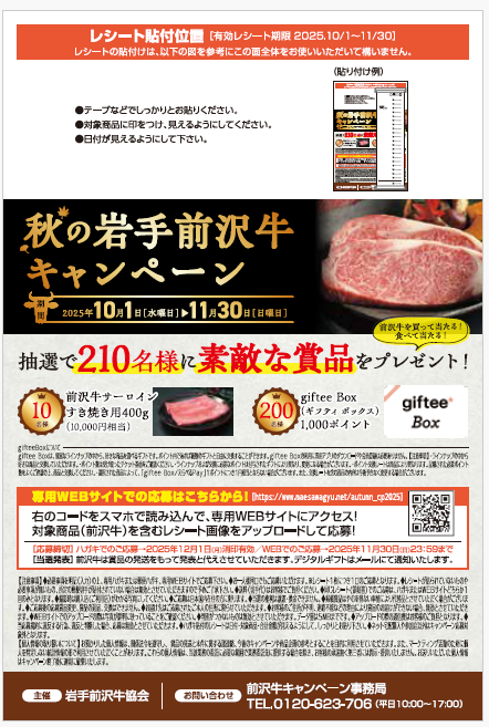 秋の岩手前沢牛協会キャンペーン事務局(0120-623-706)までお願いいたします。